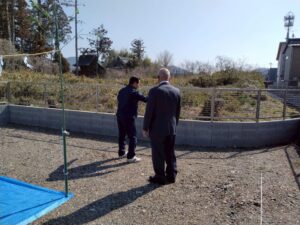 彦根からお父様が駆けつけて頂き、社長と建物の情報交換中。 娘さん曰く、「地鎮祭より社長さんと話がしたかったのかも?」(笑) そんな事は無いですよ。一人娘が心配なんですよ。