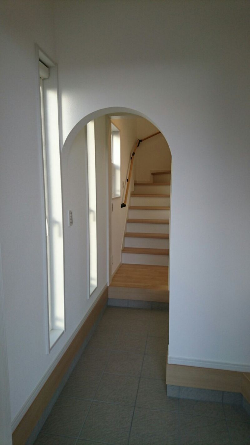 玄関に入ると、R型の壁があり奥にはシューズクロークと家族だけの玄関へ・・・